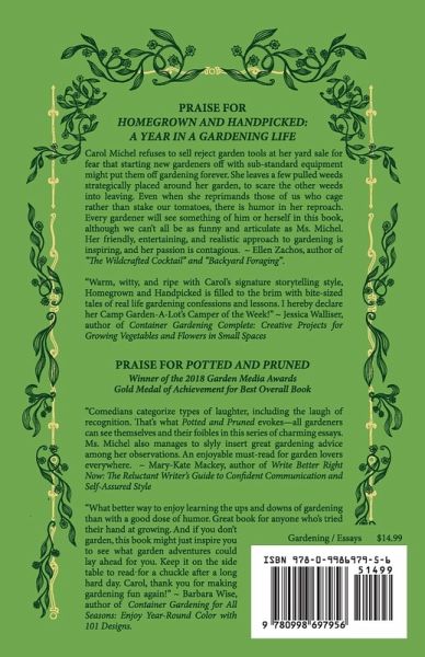 Awarded Second Place—Nonfiction Books for Adults—Humor by the Woman's Press Club of Indiana, 2019 Communications Contest "Professionally dirty clothes," "The MulchMobile," "The Gardener’s Handshake," "Thanksgiving Conversation Starters for Gardeners," and "Going Steady with a Grower" are just a few of the delightful subjects covered in Homegrown and Handpicked: A Year in a Gardening Life. Read it to discover if you have an eccentric gardener in your neighborhood or to see if, gasp, you are the eccentric gardener in your neighborhood. The sequel to the popular essay book, Potted and Pruned: Living a Gardening Life, which taught us about gardening math, distance, time, and other important fundamentals, Homegrown and Handpicked is a journey through the seasons, with just as many laugh-out-loud, hey-that’s-me stories as the first book. Read to remember why you love gardening, and keep returning to your garden again and again, despite the bugs, weeds, and marauding garden fairies running off with your tools. "A wonderful follow up to Carol Michel's first book of gardening humor! Filled with vignettes, gardening tips, letters, advice, and more; this little collection is pure fun. Just as with here first collection, this book inspires the reader to get out there and start gardening, right this second! It's cute and inspiring; and reading it at this time of year (spring) makes me want to do even more in my yard. I can't wait to get my hand on the third book in this trilogy, if anything like the first two it's going to be amazing :)" - Erin Cataldi, Librarian