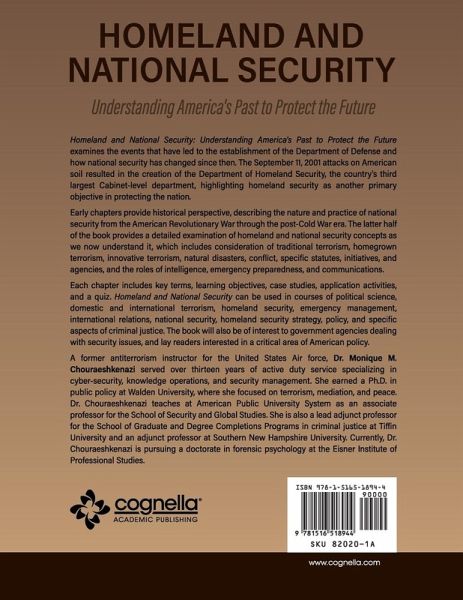 Homeland and National Security: Understanding America's Past to Protect the Futureexamines the events that have led to the establishment of the Department of Defense and how national security has changed since then. The September 11, 2001 attacks on American soil resulted in the creation of the Department of Homeland Security, the country's third largest Cabinet-level department, highlighting homeland security as another primary objective in protecting the nation. Early chapters provide historical perspective, describing the nature and practice of national security from the American Revolutionary War through the post-Cold War era. The latter half of the book provides a detailed examination of homeland and national security concepts as we now understand it, which includes consideration of traditional terrorism, homegrown terrorism, innovative terrorism, natural disasters, conflict, specific statutes, initiatives, and agencies, and the roles of intelligence, emergency preparedness, and communications. Each chapter includes key terms, learning objectives, case studies, application activities, and a quiz. Homeland and National Security can be used in courses of political science, domestic and international terrorism, homeland security, emergency management, international relations, national security, homeland security strategy, policy, and specific aspects of criminal justice. The book will also be of interest to government agencies dealing with security issues, and lay readers interested in a critical area of American policy. A former antiterrorism instructor for the United States Air force, Dr. Monique M. Chouraeshkenazi served over thirteen years of active duty service specializing in cyber-security, knowledge operations, and security management. She earned a Ph.D. in public policy at Walden University, where she focused on terrorism, mediation, and peace. Dr. Chouraeshkenazi teaches at American Public University System as an associate professor for the School of Security and Global Studies. She is also a lead adjunct professor for the School of Graduate and Degree Completions Programs in criminal justice at Tiffin University and an adjunct professor at Southern New Hampshire University. Currently, Dr. Chouraeshkenazi is pursuing a doctorate in forensic psychology at the Eisner Institute of Professional Studies.