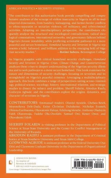 Foreword C. Jaja Nwanegbo Preface Introduction: Terrorism and Homeland Security in Nigeria: The Problématique Sheriff Folarin, Abiodun Raufu and Godwyns Agbude Chapter 1: Homeland Security Issues in Nigeria Sheriff Folarin and Chelsea Betek Chapter 2: Overview and Origin of Terrorism in Nigeria Abiodun Raufu Chapter 3: Terrorism and Human Security: Theoretical Perspectives Kester Onor and Samuel Oni Chapter 4: Understanding Contexts: Terrorism vs Insurgency and Nigeria's Security Architecture Anthony Oladoyin and Faith Olanrewaju Chapter 5: Climate Change, Environmental Justice, and Terrorism in Nigeria Edidiong Mendie Chapter 6: Other Critical Security Issues and Domestic Terrorism Dynamics Obinna Ezeihuoma Chapter 7: Effects of Terrorism on Nigeria Oluwakemi Udoh, Fadeke Olu-Owolabi and Moyosoluwa Dele-Dada Chapter 8: Nigeria's Internal Security Measures and Counterterrorism Strategy Abiodun Raufu Chapter 9: Nigeria and Global War on Terrorism Emmanuel Anabiri and Nicholas Erameh Chapter 10: Homeland Security: Lessons from Other Lands Olaniyi Ayodele, Oluwatosin Ifaloye and Eniye Christian-Dubekeme Chapter 11: Finding Solutions to Homeland Security Issues in Nigeria Godwyns Agbude Conclusion Sheriff Folarin, Abiodun Raufu, and Godwyns Agbude About the Editors About the Contributors