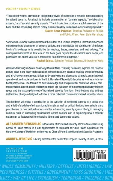 Homeland Security Cultures: Enhancing Values While Fostering Resilience explores the role that culture plays in the study and practice of homeland security in an all-hazards, whole-community, and all-of-government scope. It does so by analyzing and discussing strategic, organizational, operational, and social cultures in the U.S. Homeland Security Enterprise, as well as from an international perspective. The focus is on how knowledge and interpretation, normative values, common symbols, and/or action repertories inform the evolution of the homeland security mission space and the accomplishment of homeland security functions. Contributions also address institutional changes designed to foster a more coherent common homeland security culture. This textbook will make a contribution to the evolution of homeland security as a policy area and a field of study by offering actionable insight as well as critical thinking from scholars and practitioners on how cultural aspects matter in balancing security against liberty, in managing complex risks, in enhancing collaboration across sectors, and in explaining how a resilient nation can be fostered while enhancing liberal and democratic values.