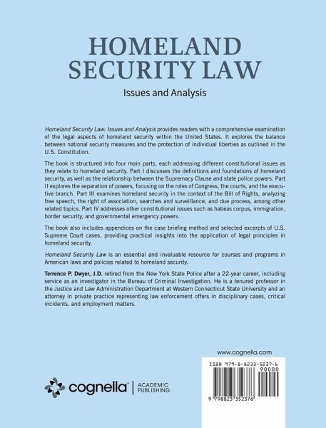 Homeland Security Law: Issues and Analysis provides readers with a comprehensive examination of the legal aspects of homeland security within the United States. It explores the balance between national security measures and the protection of individual liberties as outlined in the U.S. Constitution. The book is structured into four main parts, each addressing different constitutional issues as they relate to homeland security. Part I discusses the definitions and foundations of homeland security, as well as the relationship between the Supremacy Clause and state police powers. Part II explores the separation of powers, focusing on the roles of Congress, the courts, and the executive branch. Part III examines homeland security in the context of the Bill of Rights, analyzing free speech, the right of association, searches and surveillance, and due process, among other related topics. Part IV addresses other constitutional issues such as habeas corpus, immigration, border security, and governmental emergency powers. The book also includes appendices on the case briefing method and selected excerpts of U.S. Supreme Court cases, providing practical insights into the application of legal principles in homeland security. Homeland Security Law is an essential and invaluable resource for courses and programs in American laws and policies related to homeland security.