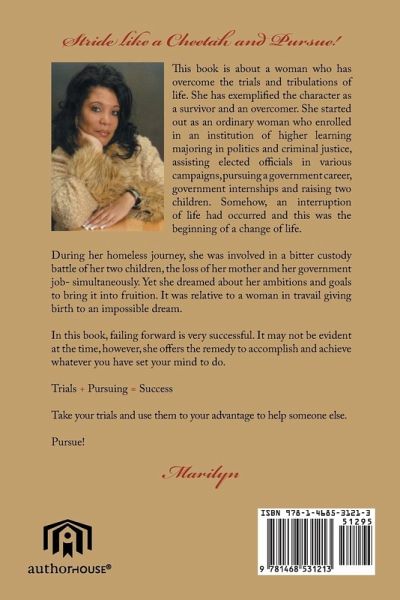 Stride like a Cheetah and Pursue! This book is about a woman who has overcome the trials and tribulations of life. She has exemplified the character as a survivor and an overcomer. She started out as an ordinary woman who enrolled in an institution of higher learning majoring in politics and criminal justice, assisting elected officials in various campaigns, pursuing a government career, government internships and raising two children. Somehow, an interruption of life had occurred and this was the beginning of a change of life. During her homeless journey, she was involved in a bitter custody battle of her two children, the loss of her mother and her government job- simultaneously. Yet she dreamed about her ambitions and goals to bring it into fruition. It was relative to a woman in travail giving birth to an impossible dream. In this book, failing forward is very successful. It may not be evident at the time, however, she offers the remedy to accomplish and achieve whatever you have set your mind to do. Trials + Pursuing = Success Take your trials and use them to your advantage to help someone else. Pursue! Marilyn