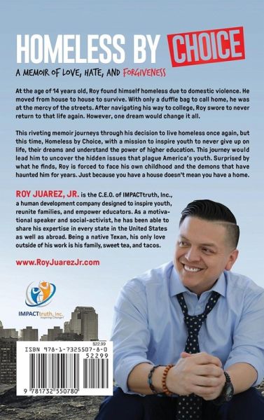 At the age of 14 years old, Roy found himself homeless due to domestic violence. He moved from house to house to survive. With only a duffle bag to call home, he was at the mercy of the streets. After navigating his way to college, Roy swore to never return to that life again. However, one dream would change it all. This riveting memoir journeys through his decision to live homeless once again, but this time, Homeless by Choice, with a mission to inspire youth to never give up on life, their dreams and understand the power of higher education. This journey would lead him to uncover the hidden issues that plague America's youth. Surprised by what he finds, Roy is forced to face his own childhood and the demons that have haunted him for years. Just because you have a house doesn't mean you have a home.