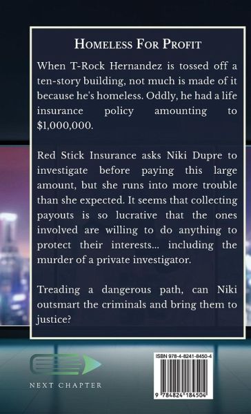 When T-Rock Hernandez is tossed off a ten-story building, not much is made of it because he's homeless. Oddly, he had a life insurance policy amounting to $1,000,000. Red Stick Insurance asks Niki Dupre to investigate before paying this large amount, but she runs into more trouble than she expected. It seems that collecting payouts is so lucrative that the ones involved are willing to do anything to protect their interests... including the murder of a private investigator. Treading a dangerous path, can Niki outsmart the criminals and bring them to justice?