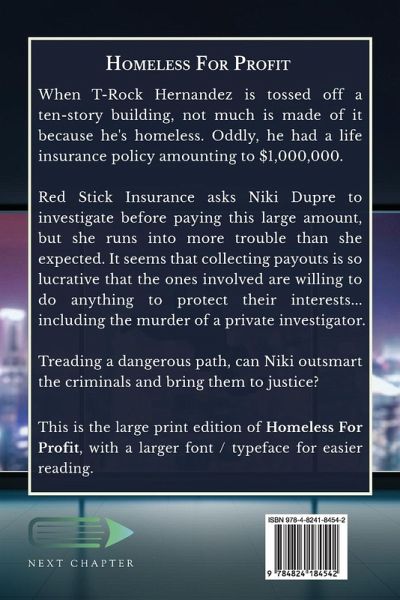When T-Rock Hernandez is tossed off a ten-story building, not much is made of it because he's homeless. Oddly, he had a life insurance policy amounting to $1,000,000. Red Stick Insurance asks Niki Dupre to investigate before paying this large amount, but she runs into more trouble than she expected. It seems that collecting payouts is so lucrative that the ones involved are willing to do anything to protect their interests... including the murder of a private investigator. Treading a dangerous path, can Niki outsmart the criminals and bring them to justice? This is the large print edition of Homeless For Profit, with a larger font / typeface for easier reading.