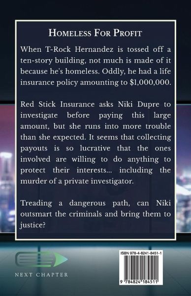 When T-Rock Hernandez is tossed off a ten-story building, not much is made of it because he's homeless. Oddly, he had a life insurance policy amounting to $1,000,000. Red Stick Insurance asks Niki Dupre to investigate before paying this large amount, but she runs into more trouble than she expected. It seems that collecting payouts is so lucrative that the ones involved are willing to do anything to protect their interests... including the murder of a private investigator. Treading a dangerous path, can Niki outsmart the criminals and bring them to justice?