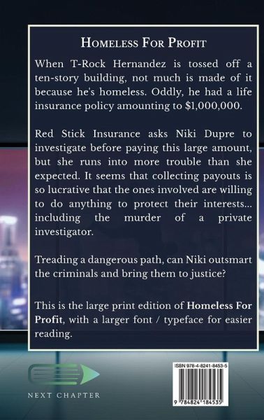 When T-Rock Hernandez is tossed off a ten-story building, not much is made of it because he's homeless. Oddly, he had a life insurance policy amounting to $1,000,000. Red Stick Insurance asks Niki Dupre to investigate before paying this large amount, but she runs into more trouble than she expected. It seems that collecting payouts is so lucrative that the ones involved are willing to do anything to protect their interests... including the murder of a private investigator. Treading a dangerous path, can Niki outsmart the criminals and bring them to justice? This is the large print edition of Homeless For Profit, with a larger font / typeface for easier reading.