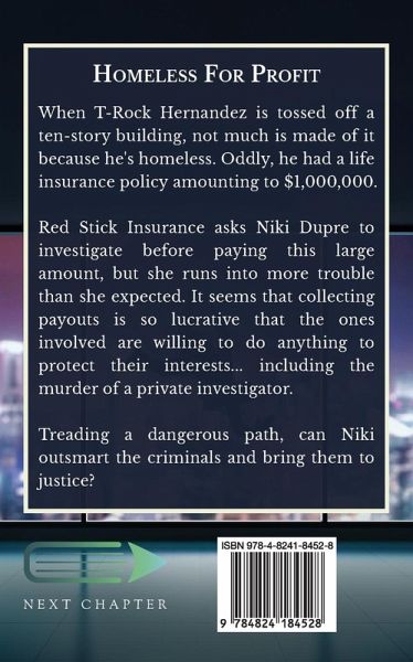 When T-Rock Hernandez is tossed off a ten-story building, not much is made of it because he's homeless. Oddly, he had a life insurance policy amounting to $1,000,000. Red Stick Insurance asks Niki Dupre to investigate before paying this large amount, but she runs into more trouble than she expected. It seems that collecting payouts is so lucrative that the ones involved are willing to do anything to protect their interests... including the murder of a private investigator. Treading a dangerous path, can Niki outsmart the criminals and bring them to justice?