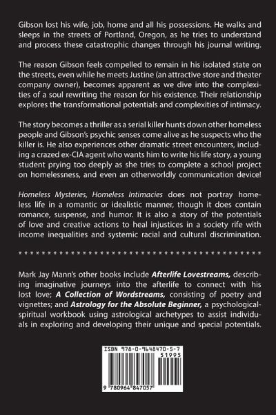 Mark Jay Mann began writing Homeless Mysteries, Homeless Intimacies in the late 1980s as he recognized the negative effects of the growing income equality on citizen's lives that was causing people getting stuck in meaningless low wage jobs, a lack of health care and homelessness. He completed the first draft of this novel at the beginning of the 1990s. He set it aside to pursue other projects. Then in 2011 he revised and self-published the novel as an eBook. He realized that unfortunately income inequality and the resulting issues of homelessness had not been addressed. Gibson Calhoun is a 37-year old man who has lost his job, his house, his wife and all of his material possessions and ends up homeless on the streets of Portland, Oregon. Through his journal writing, he tries to understand the catastrophic changes that have happened to him. Gibson's story is set against the backdrop of an urban society at times harsh and dangerous, and at other times caring and hopeful, but still a society that is allowing more and more of its citizens to exist in meaningless, low wage jobs and in poverty, widespread systemic racial disparities and to become homeless. Gibson feels he must remain on the streets, separate from others, even when he meets a woman to whom he is deeply attracted, and who owns an exotic second hand store and a theater company. She reaches out to him and talks him into working for her at the store for a few hours each week. As Gibson struggles to survive as a homeless person, he is confronted by mysteries that challenge, confuse and frighten him, including the serial killings of other homeless men and women as they sleep on the streets at night. He has psychic visions of the killer, but does not know how to act on his suspicions without becoming one of the victims if he is correct. He is also confronted with other strange and unsettling encounters, including the homeless man who shows him evidence of outer space aliens living in the city; another man who is an ex-CIA assassin who wants him to write his life story; a 16-girl who is afraid of becoming homeless and who attaches herself to him. Homeless Mysteries, Homeless Intimacies is a novel about the healing power of love and intimacy. It is a story of the dramatic and transformative spiritual journey of a homeless man, and the potentials of dramatic creativity to heal and transform society to become more caring and inclusive.