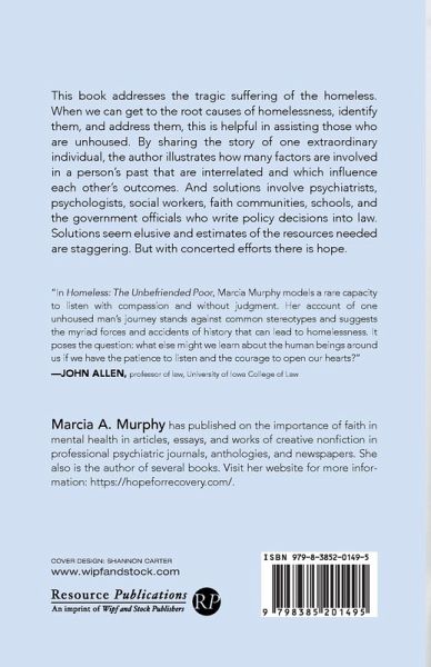 This book addresses the tragic suffering of the homeless. When we can get to the root causes of homelessness, identify them, and address them, this is helpful in assisting those who are unhoused. By sharing the story of one extraordinary individual, the author illustrates how many factors are involved in a person's past that are interrelated and which influence each other's outcomes. And solutions involve psychiatrists, psychologists, social workers, faith communities, schools, and the government officials who write policy decisions into law. Solutions seem elusive and estimates of the resources needed are staggering. But with concerted efforts there is hope.