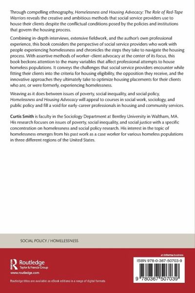 Drawing on his in-depth, ethnographic fieldwork and his own professional experiences as an advocate for the down-but-not-out, Curtis Smith illuminates the perspective and street-level grind of social service workers to negotiate the maze of bureaucratic red-tape and polices to house their homeless clients. In doing so, Smith's Homelessness and Housing Advocacy: The Role of Red-Tape Warriors is a most welcome and compelling addition to the social science research and literature on homelessness, particularly on the dogged and resourceful efforts of those "street-level bureaucrats" advocating on behalf of the homeless. - David A. Snow, University of California, Irvine