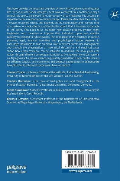 This book provides an important overview of how climate-driven natural hazards like river or pluvial floods, droughts, heat waves or forest fires, continue to play a central role across the globe in the 21st century. Urban resilience has become an important term in response to climate change. Resilience describes the ability of a system to absorb shocks and depends on the vulnerability and recovery time of a system. A shock affects a system to the extent that it becomes vulnerable to the event. This book focus examines how private property-owners might implement such measures or improve their individual coping and adaptive capacity to respond to future events. The book looks at the existence of various planning, legal, financial incentives and psychological factors designed to encourage individuals to take an active role in natural hazard risk management and through the presentation of theoretical discussions and empirical cases shows how urban resilience can be achieved. Inaddition, the book guides the reader through different conceptual frameworks by showing how urban regions are trying to reach urban resilience on privately-owned land. Each chapter focuses on different cultural, socio-economic and political backgrounds to demonstrate how different institutional frameworks have an impact.