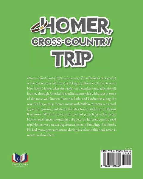 Homer, Cross Country Trip, is a true story (from Homer's perspective) of the adventurous trek from San Diego, California to Little Genesee, New York. Homer takes the reader on a comical (and educational) journey through America's beautiful countryside with stops at some of the most well known National Parks and landmarks along the way. On his journey, Homer roams with buffalo, witnesses an actual geyser in motion, and shares his idea for an addition to Mount Rushmore. With his owners in tow and poop bags ready to go, Homer experiences the grandest of quests on his cross country road trip! Homer was a rescue dog from a shelter in San Diego, California. He had many great adventures during his life and this book series is meant to share them.
