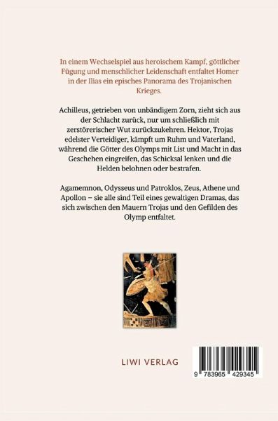 In einem Wechselspiel aus heroischem Kampf, göttlicher Fügung und menschlicher Leidenschaft entfaltet Homer in der Ilias ein episches Panorama des Trojanischen Krieges. Achilleus, getrieben von unbändigem Zorn, zieht sich aus der Schlacht zurück, nur um schließlich mit zerstörerischer Wut zurückzukehren. Hektor, Trojas edelster Verteidiger, kämpft um Ruhm und Vaterland, während die Götter des Olymps mit List und Macht in das Geschehen eingreifen, das Schicksal lenken und die Helden belohnen oder bestrafen. Agamemnon, Odysseus und Patroklos, Zeus, Athene und Apollon - sie alle sind Teil eines gewaltigen Dramas, das sich zwischen den Mauern Trojas und den Gefilden des Olymp entfaltet. Die Welt der Ilias ist eine von Ehre und Rache, von Ruhm und Untergang - untrennbar verknüpft mit dem unaufhaltsamen Lauf des Schicksals. Mit kunstvoller Bildsprache erschafft Homer ein Werk, das die Grundfragen menschlicher Existenz verhandelt. Mit meisterhaftem Gespür für Rhythmus und Klang bewahrt Voß in seiner Übersetzung die ursprüngliche Kraft der Hexameter und macht die archaische Welt der Griechen lebendig: die donnernden Streitwagen, die eifersüchtigen Götter, den dröhnenden Kampflärm. Hier frisch aufgelegt als gebundene Ausgabe in gut lesbarer Schriftgröße. Homer. Ilias. Übersetzt von Johann Heinrich Voß. Entstehung: Vermutlich 8. oder 7. Jahrhundert v. Chr. Erstdruck der Übersetzung von Johann Heinrich Voß: Johann Friedrich Hammerich, Altona 1793. Durchgesehener Neusatz, der Text dieser Ausgabe folgt: Insel Verlag, Frankfurt am Main 1990. Vollständige Neuausgabe, Göttingen 2025. LIWI Literatur- und Wissenschaftsverlag
