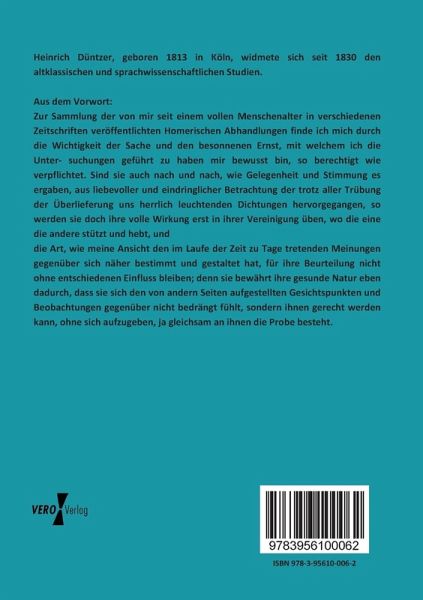 Zur Sammlung der von mir seit einem vollen Menschenalter in verschiedenen Zeitschriften veröffentlichten Homerischen Abhandlungen finde ich mich durch die Wichtigkeit der Sache und den besonnenen Ernst, mit welchem ich die Unter- suchungen geführt zu haben mir bewusst bin, so berechtigt wie verpflichtet. Sind sie auch nach und nach, wie Gelegenheit und Stimmung es ergaben, aus liebevoller und eindringlicher Betrachtung der trotz aller Trübung der Überlieferung uns herrlich leuchtenden Dichtungen hervorgegangen, so werden sie doch ihre volle Wirkung erst in ihrer Vereinigung üben, wo die eine die andere stützt und hebt, und