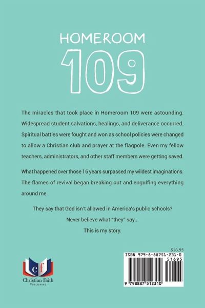 The miracles that took place in Homeroom 109 were astounding. Widespread student salvations, healings, and deliverance occurred. Spiritual battles were fought and won as school policies were changed to allow a Christian club and prayer at the flagpole. Even my fellow teachers, administrators, and other staff members were getting saved. What happened over those 16 years surpassed my wildest imaginations. The flames of revival began breaking out and engulfing everything around me. They say that God isn't allowed in America's public schools? Never believe what "they" say... This is my story.