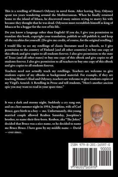 This is a retelling of Homer's Odyssey in novel form. After leaving Troy, Odyssey spent ten years wandering around the Mediterranean. When he finally returned home to the island of Ithaca, he discovered many suitors trying to marry his wife because they thought that he was dead. Odysseus must reestablish himself as king of Ithaca or be a beggar for the rest of his life. Do you know a language other than English? If you do, I give you permission to translate this book, copyright your translation, publish or self-publish it, and keep all the royalties for yourself. (Do give me credit, of course, for the original retelling.) I would like to see my retellings of classic literature used in schools. Teachers need not actually teach my retellings. Teachers are welcome to give students copies of my eBooks as background material. For example, if they are teaching Homer's Iliad and Odyssey, teachers are welcome to give students copies of my Virgil's Aeneid: A Retelling in Prose and tell students, "Here's another ancient epic you may want to read in your spare time."