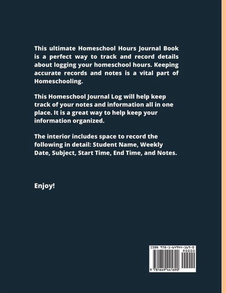 This Homeschool Hours Log planner is a great way to record and will help you track your student homeschooling time. It's a perfect way to plan for and document any law requirements for home school. Each interior page includes space to record: Student Name - Write your student's name.Weekly Date - Log the week of and the year. Undated for your convenience. Subject - Record the subject. Start Time - For writing the time you start the subject. End Time - Log the time you end the subject. Notes - Write any other important information you choose, for example, core learning curriculum, noncore learning, lesson, attendance, special activities, nature walk, tests results, your state laws such as Missouri, what you're planning every day, etc. Simple and easy to use. Books and Logbooks make keeping all your important info all in one place easier. Designed for the homeschool mom. Also makes a great gift for that special homeschool mom. Large size is 8.5x11 inches, 106 pages, white paper, black ink, soft matte finish cover, paperback.