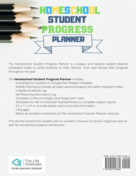 The Homeschool Student Progress Planner is a unique and tailored student planner developed solely to assist students to Plan, Record, Track and Review their progress throughout the year. The Homeschool Student Progress Planner includes: · A template for students to include their Weekly Timetable · Weekly Planning to include all Class Lessons/Subjects and other important notes · Self-Reporting Attendance Log · Templates to Record Subject and Assignment Tasks · Templates for the Homeschool Teacher/Parent to complete subject reports · 8.5 x 11 inch to provide ample room to provide information · 140 pages · Makes an excellent companion to The Homeschool Teacher Planner resource Provide the homeschool student with an excellent resource to remain organized and on-task for homeschool subjects and lessons.