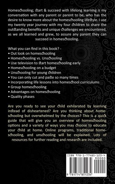 Homeschooling; start & succeed with lifelong learning is my conversation with any parent or parent to be, who has the desire to know more about the homeschooling lifestyle. I use my twenty year journey with my four children to share the outstanding benefits and unique challenges we encountered, as we all learned and grew, to assure any parent they can succeed in homeschooling. What you can find in this book? - · Out look on homeschooling · Homeschooling vs. Unschooling · Use television to start homeschooling early · Homeschooling on a budget · Unschooling for young children · You can only cut and paste so many times · Incorporating life lessons into homeschool curriculums · Group homeschooling · Advantages on homeschooling · Quality phases Are you ready to see your child exhilarated by learning instead of disheartened? Are you thinking about homeschooling but overwhelmed by the choices? This is a quick guide that will give you an overview of homeschooling options and a variety of ways you may choose to educate your child at home. Online programs, traditional homeschooling, and unschooling will be explained. Lots of resources for further reading and research are included.
