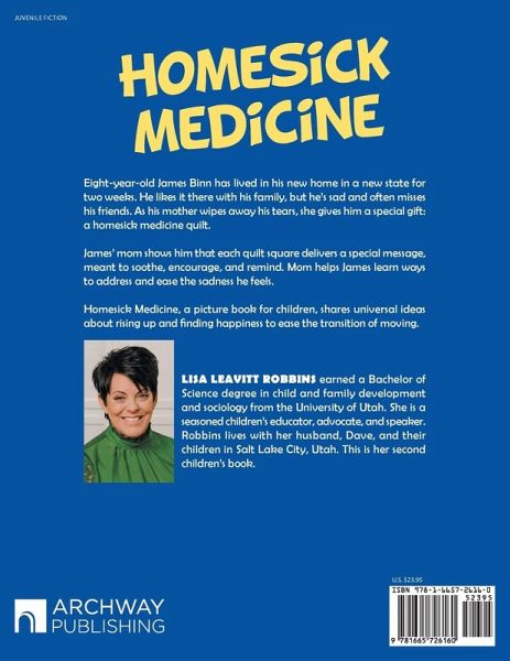 Eight-year-old James Binn has lived in his new home in a new state for two weeks. He likes it there with his family, but he's sad and often misses his friends. As his mother wipes away his tears, she gives him a special gift: a homesick medicine quilt. James' mom shows him that each quilt square delivers a special message, meant to soothe, encourage, and remind. Mom helps James learn ways to address and ease the sadness he feels. Homesick Medicine, a picture book for children, shares universal ideas about rising up and finding happiness to ease the transition of moving.