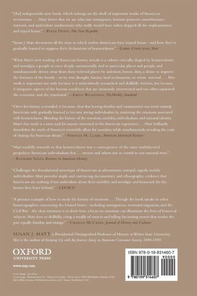 Homesickness today is dismissed as a sign of immaturity, what children feel at summer camp, but in the nineteenth century it was recognized as a powerful emotion. When gold miners in California heard the tune "Home, Sweet Home," they sobbed. When Civil War soldiers became homesick, army doctors sent them home, lest they die. Such images don't fit with our national mythology, which celebrates the restless individualism of colonists, explorers, pioneers, soldiers, and immigrants who supposedly left home and never looked back. Using letters, diaries, memoirs, medical records, and psychological studies, this wide-ranging book uncovers the profound pain felt by Americans on the move from the country's founding until the present day. Susan Matt shows how colonists in Jamestown longed for and often returned to England, African Americans during the Great Migration yearned for their Southern homes, and immigrants nursed memories of Sicily and Guadalajara and, even after years in America, frequently traveled home. These iconic symbols of the undaunted, forward-looking American spirit were often homesick, hesitant, and reluctant voyagers. National ideology and modern psychology obscure this truth, portraying movement as easy, but in fact Americans had to learn how to leave home, learn to be individualists. Even today, in a global society that prizes movement and that condemns homesickness as a childish emotion, colleges counsel young adults and their families on how to manage the transition away from home, suburbanites pine for their old neighborhoods, and companies take seriously the emotional toll borne by relocated executives and road warriors. In the age of helicopter parents and boomerang kids, and the new social networks that sustain connections across the miles, Americans continue to assert the significance of home ties. By highlighting how Americans reacted to moving farther and farther from their roots, Homesickness: An American History revises long-held assumptions about home, mobility, and our national identity.