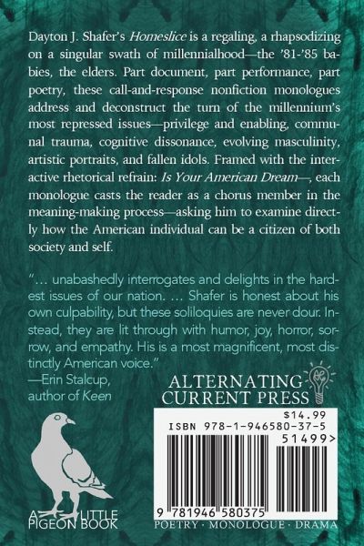 "Dayton J. Shafer's Homeslice is a regaling, a rhapsodizing on a singular swath of Millennialhood-the '81-'85 babies, the elders. Part document, part performance, part poetry, these call-and-response nonfiction monologues address and deconstruct the turn of the millennium's most repressed issues-privilege and enabling, communal trauma, cognitive dissonance, evolving masculinity, artistic portraits, and fallen idols. Framed with the interactive rhetorical refrain: Is Your American Dream-, each monologue casts the reader as a chorus member in the meaning-making process-asking him to examine directly how the American individual can be a citizen of both society and self"--