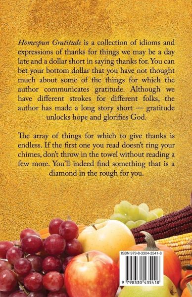 Homespun Gratitude is a collection of the author's written devotionals of thanks. Each devotional uses an idiom and related topic. The author expands on the topic and expresses reasons for which we need to be thankful. The majority of the devotionals convey appreciation to God for the physical blessings we experience. Some focus on our spiritual lessons and blessings. All communicate our gratitude to God for the gift of life.