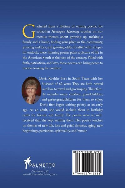 This collection of rhyming poetry brings together a lifetime of musings and insights from a mother and grandmother living in the American South. Doris Koehler began writing poems at a very young age. Now retired with children, grandchildren, and great-grandchildren, Doris shares her collection which includes poems written at every stage of her life. Humorous, contemplative, and heartfelt, her poems paint a wholistic picture of the human connections she made across decades, the new beginnings she embarked on, her cultural beliefs and spiritual insights, and the miracles in day-to-day life. Touching on themes of growing up, creating a family and a home, finding your place in the community, living in faith, grieving and loss, and growing older, these poems are a cozy comfort for the reader looking for a wholesome collection. Crafted with traditional rhyme, this collection is perfect to read and share aloud with friends and family or to curl up with and read alone. The cadence and rhythm of the words will appeal to fans of simple style who still desire to see profound messages in what they read. Homespun Harmony offers readers a warm and intimate look at community in the home and in the nation. Homespun Harmony is the perfect restful collection to read by the fire.