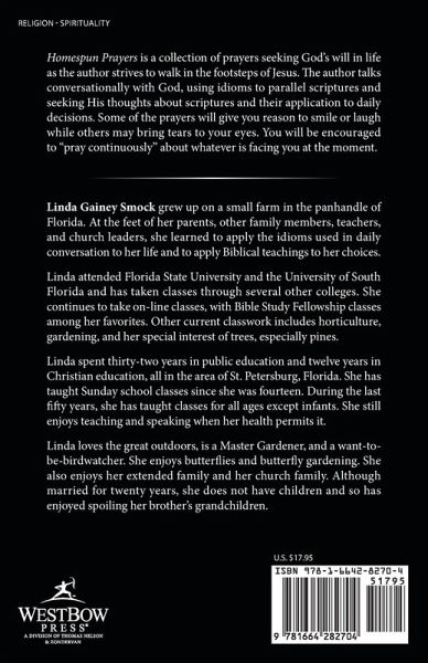 Homespun Prayers is a collection of prayers seeking God's will in life as the author strives to walk in the footsteps of Jesus. The author talks conversationally with God, using idioms to parallel scriptures and seeking His thoughts about scriptures and their application to daily decisions. Some of the prayers will give you reason to smile or laugh while others may bring tears to your eyes. You will be encouraged to "pray continuously" about whatever is facing you at the moment.