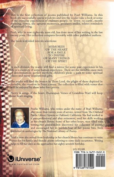 This is the first collection of poems published by Pearl Williams. In this book she successfully opens windows and lets the reader take a look at some of the everyday experiences of ordinary people. In 'down -to-earth', mostly rhyming, verses, she upturns memories, produces smiles, relates reminders of spiritual living. Pearl, who in now eighty-six years old, has done most of her writing in the last twenty years. Her collection compares favorably with other published authors. The book is divided into six selections: MEMORIES OF THE HEART FOR A SMILE TO INSPIRE OF MANY THINGS OF THE SPIRIT In each division the reader will find a mirror for some past experience in his life or a memory of some human experience. There are the invisible ones; men of determination; perfect mothers; children's pleas; a path to some spiritual places and many inspirational gifts. The reader will find the humor in Them Lord, the plight of those depicted in Invisible, the emotion in Peter: a story. The collection is filled with verses that will be enjoyed by those who love poetry. Poetry is songs of the heart. Homespun Verses of Grandma Pearl will keep your heart singing.