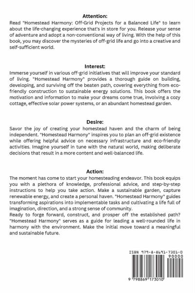 Welcome to "Homestead Harmony: Off-Grid Projects for a Balanced Life." This e-book is more than just a guide; it's your passport to a less ordinary life that embracessimplicity, self-sufficiency, and the allure of off-grid living. In a world constantly in a rush, this book is your compass,guiding you through projects, ideas, and practices thatempower you to build a fulfilling life off the traditional grid.Our subtitle, "Create, Build, and Thrive Off the BeatenPath," encapsulates the essence of our shared adventure. In the following pages, we will go on a homesteading journey, digging into the concepts, projects, and viewpoints that characterize a lifestyle that is off-grid and balanced. The homestead lifestyle is not only a movement; it is a philosophy that involves making a conscious decision to establish a connection with the land, engage in sustainable practices, and build a feeling of autonomy. If you are a seasoned homesteader or just beginning to dream of a life off the beaten road, this e-book is meant to inspire, enlighten, and lead you through the complexities of constructing your own hideaway in the woods. It is accessible to anybody interested in homesteading. The chapters that are to come will reveal a rich tapestry of information, beginning with the basic idea of your farm and progressing down to the specifics of sustainable energy, water management, and shelter building. We will discuss the pleasures of cultivating your food, preparing meals without the need for electricity, and developing a harmonious and self-sufficient lifestyle. Along the process, you will learn how to balance technological advancements and the simplicity of living off the grid. This will ensure that your homestead is a place to relax and a vibrant community linked to one another.