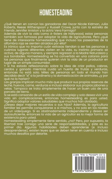 Si siempre ha querido decir "sí" a la agricultura familiar, pero no sabe por dónde empezar, continúe leyendo... Muchas personas famosas y exitosas están adoptando la vida de granja. Homesteading se ha convertido en una catarsis para las personas que finalmente quieren vivir la vida de un productor en lugar de un simple consumidor. Miles de personas en todo el mundo han decidido decir "sí" a la jardinería y la domesticación de animales. Pero ¿se siente inseguro y vacilante al intentarlo? Si es así, ha venido al lugar correcto. Como verá, la agricultura familiar no tiene por qué ser difícil. Este libro le proporcionará la información y las herramientas necesarias. Esta es solo una parte de lo que descubrirá en este libro:Las poderosas técnicas para realizar homesteading. Las 11 habilidades esenciales de homesteading. Por qué expandir su granja familiar demasiado pronto puede perjudicar su progreso y lo que debe hacer en su lugar. Cómo obtener el terreno adecuado sin arruinarse económicamente. Las falsedades que informan las compañías OGM sobre su comida. Cómo ahorrar dinero con un simple cambio en su rutina. Un consejo proporcionado por Brett McLeod de la Universidad Antioch New England, que le ayudará a encontrar un medio alternativo al consumismo convencional. El error más grande que cometen las personas en homesteading. Las 14 ideas de ingresos en homesteading para ayudarle a seguir adelante. La investigación realizada por el Homestead National Monument of America demostró que las minorías tenían el mayor impacto en términos de mejoras en la agricultura familiar. Y otra disertación señaló la sostenibilidad de la agricultura familiar, lo que significa que puede disfrutar de sus beneficios sin tener que fallar en el intento. Tómese un segundo para imaginar cómo se sentirá una vez que finalmente aprenda los fundamentos de homesteading y cómo reaccionarán su familia y amigos cuando finalmente pueda proporcionar comida para su familia (e incluso para sus vecinos). ¡Obtenga ahora este libro para aprender más sobre homesteading!