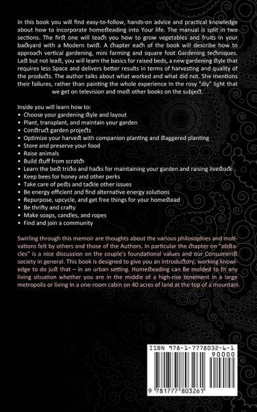 In this book you will find easy-to-follow, hands-on advice and practical knowledge about how to incorporate homesteading into Your life. The manual is split in two sections. The first one will teach you how to grow vegetables and fruits in your backyard with a Modern twist. A chapter each of the book will describe how to approach vertical gardening, mini farming and square foot Gardening techniques. Inside you will learn how to: . Choose your gardening style and layout . Plant, transplant, and maintain your garden . Construct garden projects . Optimize your harvest with companion planting and staggered planting . Store and preserve your food . Raise animals . Build stuff from scratch . Learn the best tricks and hacks for maintaining your garden and raising livestock . Keep bees for honey and other perks . Take care of pests and tackle other issues . Be energy efficient and find alternative energy solutions . Repurpose, upcycle, and get free things for your homestead . Be thrifty and crafty . Make soaps, candles, and ropes . Find and join a community Swirling through this memoir are thoughts about the various philosophies and motivations felt by others and those of the Authors. In particular the chapter on "obstacles" is a nice discussion on the couple's foundational values and our Consumerist society in general. This book is designed to give you an introductory, working knowledge to do just that - in an urban setting. Homesteading can Be molded to fit any living situation whether you are in the middle of a high-rise tenement in a large metropolis or living In a one-room cabin on 40 acres of land at the top of a mountain.