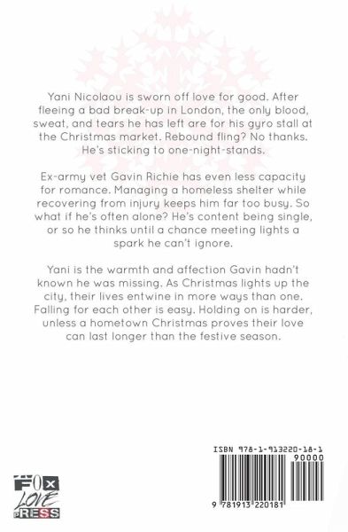 Yani Nicolaou is sworn off love for good. After fleeing a bad break-up in London, the only blood, sweat, and tears he has left are for his gyro stall at the Christmas market. Rebound fling? No thanks. He’s sticking to one-night-stands. Ex-army vet Gavin Richie has even less capacity for romance. Managing a homeless shelter while recovering from injury keeps him far too busy. So what if he’s often alone? He’s content being single, or so he thinks until a chance meeting lights a spark he can’t ignore. Yani is the warmth and affection Gavin hadn’t known he was missing. As Christmas lights up the city, their lives entwine in more ways than one. Falling for each other is easy. Holding on is harder, unless a hometown Christmas proves their love can last longer than the festive season.