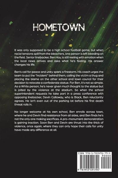It was only supposed to be a high school football game, but when racial tensions spill from the bleachers, one person is left bleeding on the field. Senior linebacker, Ben Hoy, is still reeling with emotion when the local news arrives and asks what he's feeling. His answer changes his life. Ben's call for peace and unity spark a firestorm. His coach urges the team to put the "incident" behind them, calling the victim a thug and placing the blame on the other school and town council for their decision to relocate a confederate statue. For Ben, it's not so simple. As a White person, he's never given much thought to the statue but is jolted by the violence at the stadium. So when the school superintendent requests he take part in a press conference with opposing linebacker, Devin Calloway, who is Black, Ben reluctantly agrees. He isn't even out of the parking lot before his first death threat rolls in. No longer welcome at his own school, Ben enrolls across town, where he and Devin find resistance from all sides, and Ben finds he's not the only one making sacrifices. A pro-monument demonstration is gaining traction. Soon Ben and Devin are thrust into the thick of violence, once again, where they can only hope their calls for unity have made any difference at all.