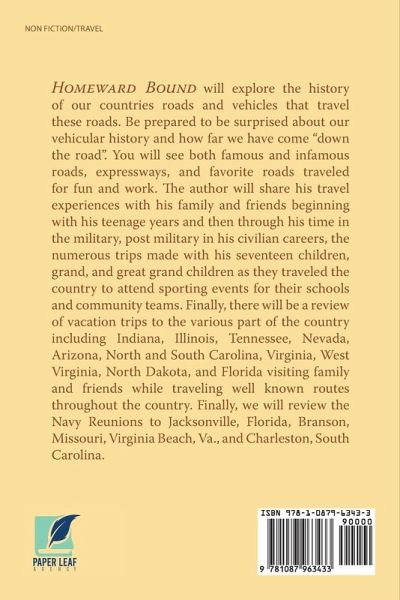 Homeward Bound will explore the history of our countries roads and vehicles that travel these roads. Be prepared to be surprised about our vehicular history and how far we have come "down the road". You will see both famous and infamous roads, expressways, and favorite roads traveled for fun and work. The author will share his travel experiences with his family and friends beginning with his teenage years and then through his time in the military, post military in his civilian careers, the numerous trips made with his seventeen children, grand, and great grand children as they traveled the country to attend sporting events for their schools and community teams. Finally, there will be a review of vacation trips to the various part of the country including Indiana, Illinois, Tennessee, Nevada, Arizona, North and South Carolina, Virginia, West Virginia, North Dakota, and Florida visiting family and friends while traveling well known routes throughout the country. Finally, we will review the Navy Reunions to Jacksonville, Florida, Branson, Missouri, Virginia Beach, Va., and Charleston, South Carolina.