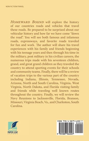 Homeward Bound will explore the history of our countries roads and vehicles that travel these roads. Be prepared to be surprised about our vehicular history and how far we have come "down the road". You will see both famous and infamous roads, expressways, and favorite roads traveled for fun and work. The author will share his travel experiences with his family and friends beginning with his teenage years and then through his time in the military, post military in his civilian careers, the numerous trips made with his seventeen children, grand, and great grand children as they traveled the country to attend sporting events for their schools and community teams. Finally, there will be a review of vacation trips to the various part of the country including Indiana, Illinois, Tennessee, Nevada, Arizona, North and South Carolina, Virginia, West Virginia, North Dakota, and Florida visiting family and friends while traveling well known routes throughout the country. Finally, we will review the Navy Reunions to Jacksonville, Florida, Branson, Missouri, Virginia Beach, Va., and Charleston, South Carolina.