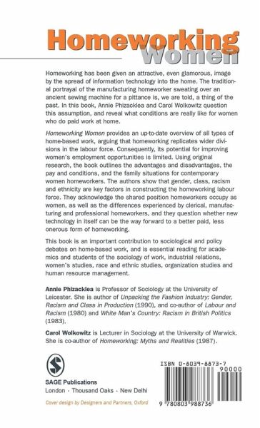 In this book the authors argue that homeworking replicates wider divisions in the labour force and that its potential for improving women's employment opportunities is therefore limited. Using original research, they outline the advantages and disadvantages, the pay and conditions, and the family situations for contemporary women homeworkers. Gender, class, racism and ethnicity are shown to be key factors in constructing the homeworking labour force.