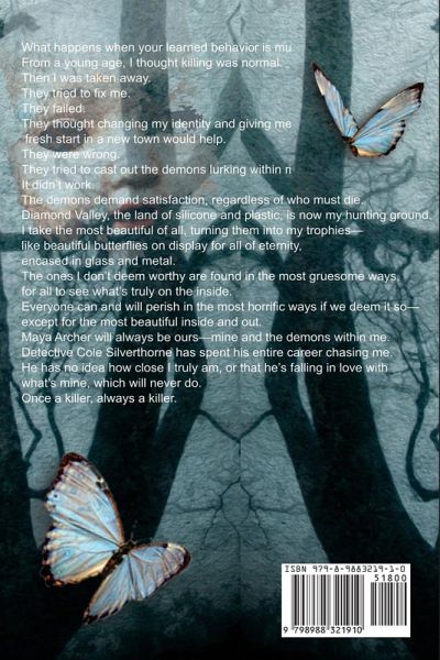 What happens when your learned behavior is murder? From a young age, I thought killing was normal. Then I was taken away. They tried to fix me. They failed. They thought changing my identity and giving me a fresh start in a new town would help. They were wrong. They tried to cast out the demons lurking within my mind. It didn't work. The demons demand satisfaction, regardless of who must die. Diamond Valley, the land of silicone and plastic, is now my hunting ground. I take the most beautiful of all, turning them into my trophies-like beautiful butterflies on display for eternity, encased in glass and metal. The ones I don't deem worthy are found in the most gruesome ways, for all to see what's truly on the inside. Everyone can and will perish in the most horrific ways if we deem it so-except for the most beautiful inside and out. Maya Archer will always be ours-mine and the demons within me. Detective Cole Silverthorne has spent his entire career chasing me. He has no idea how close I truly am, or that he's falling in love with what's mine, which will never do. Once a killer, always a killer.