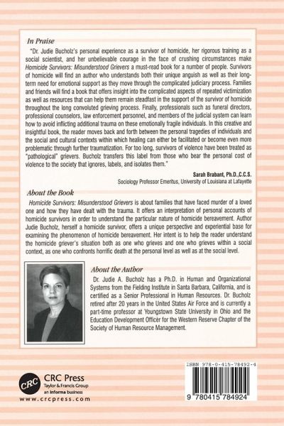 "Homicide Survivors: Misunderstood Grievers" is about families that have faced murder and how they have dealt with the trauma. It offers an interpretation of personal accounts of homicide survivors in order to understand the particular nature of homicide bereavement. The author herself a homicide survivor, Judie Bucholz offers a unique perspective and experiential base for examining the phenomenon of homicide bereavement. Her intent is to help the reader understand the homicide griever's situation both as one who grieves and one who grieves within a social context, as one who confronts horrific death at the personal level as well as at the social level.