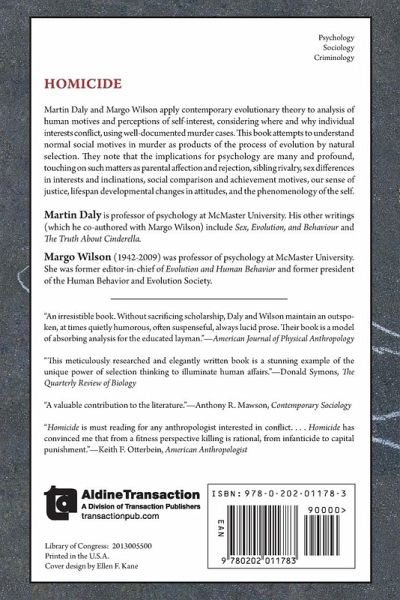 The human race spends a disproportionate amount of attention, money, and expertise in solving, trying, and reporting homicides, as compared to other social problems. The public avidly consumes accounts of real-life homicide cases, and murder fiction is more popular still. Nevertheless, we have only the most rudimentary scientific understanding of who is likely to kill whom and why. Martin Daly and Margo Wilson apply contemporary evolutionary theory to analysis of human motives and perceptions of self-interest, considering where and why individual interests conflict, using well-documented murder cases. This book attempts to understand normal social motives in murder as products of the process of evolution by natural selection. They note that the implications for psychology are many and profound, touching on such matters as parental affection and rejection, sibling rivalry, sex differences in interests and inclinations, social comparison and achievement motives, our sense of justice, lifespan developmental changes in attitudes, and the phenomenology of the self. This is the first volume of its kind to analyze homicides in the light of a theory of interpersonal conflict. Before this study, no one had compared an observed distribution of victim-killer relationships to "expected" distribution, nor asked about the patterns of killer-victim age disparities in familial killings. This evolutionary psychological approach affords a deeper view and understanding of homicidal violence.