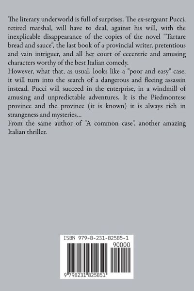 The literary underworld is full of surprises. The ex-sergeant Pucci, retired marshal, will have to deal, against his will, with the inexplicable disappearance of the copies of the novel "Tartare bread and sauce", the last book of a provincial writer, pretentious and vain intriguer, and all her court of eccentric and amusing characters worthy of the best Italian comedy. However, what that, as usual, looks like a "poor and easy" case, it will turn into the search of a dangerous and fleeing assassin instead. Pucci will succeed in the enterprise, in a windmill of amusing and unpredictable adventures. It is the Piedmontese province and the province (it is known) it is always rich in strangeness and mysteries... From the same author of "A common case", another amazing Italian thriller.