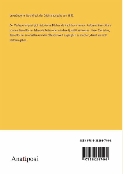 Unveränderter Nachdruck der Originalausgabe von 1856. Der Verlag Anatiposi gibt historische Bücher als Nachdruck heraus. Aufgrund ihres Alters können diese Bücher fehlende Seiten oder mindere Qualität aufweisen. Unser Ziel ist es, diese Bücher zu erhalten und der Öffentlichkeit zugänglich zu machen, damit sie nicht verloren gehen.