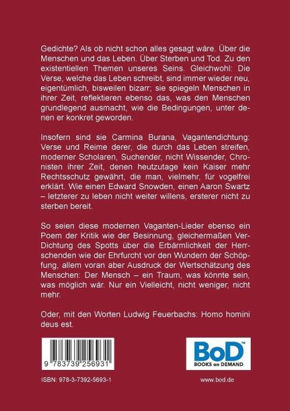 Gedichte? Als ob nicht schon alles gesagt wäre. Über die Menschen und das Leben. Über Sterben und Tod. Zu den existentiellen Themen unseres Seins. Gleichwohl: Die Verse, welche das Leben schreibt, sind immer wieder neu, eigentümlich, bisweilen bizarr; sie spiegeln Menschen in ihrer Zeit, reflektieren ebenso das, was den Menschen grundlegend ausmacht, wie die Bedingungen, unter denen er konkret geworden. Insofern sind sie Carmina Burana, Vagantendichtung: Verse und Reime derer, die durch das Leben streifen, moderner Scholaren, Suchender, nicht Wissender, Chronisten ihrer Zeit, denen heutzutage kein Kaiser mehr Rechtsschutz gewährt, die man, vielmehr, für vogelfrei erklärt. Wie einen Edward Snowden, einen Aaron Swartz - letzterer zu leben nicht weiter willens, ersterer nicht zu sterben bereit.So seien diese modernen Vaganten-Lieder ebenso ein Poem der Kritik wie der Besinnung, gleichermaßen Ver-Dichtung des Spotts über die Erbärmlichkeit der Herrschenden wie der Ehrfurcht vor den Wundern der Schöpfung, allem voran aber Ausdruck der Wertschätzung des Menschen: Der Mensch - ein Traum, was könnte sein, was möglich wär. Nur ein Vielleicht, nicht weniger, nicht mehr.Oder, mit den Worten Ludwig Feuerbachs: Homo homini deus est.