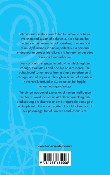 Behavioural scientists have failed to unravel a coherent evolution and system of behaviour. It is a failure that hinders our understanding of ourselves, of others and of our dysfunctions. Homo Imperfectus is a personal endeavour to correct this failure; it is the result of decades of research and reflection. Every organism engages in behaviour which registers change, evaluates it and decides on a response. The behavioural system arose from a simple polarisation of change, and of response. Through millennia of evolution, it eventually arrived at our complex, but fragile, human neuro-psychology. The almost accidental explosion of human intelligence creates an overload of our vital decision-making hub, predisposing it to disorder and the irreparable damage of schizophrenia. It is not a disorder of our biochemistry, of our physiology, but of how we conduct our lives.