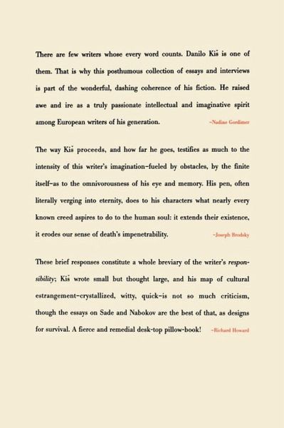 Serbian writer Danilo Kis was preoccupied with man's dehumanization in a mechanized, totalitarian world. His dazzling fiction established him as one of the most artful and eloquent authors of postwar Europe. In this first collection of his non-fiction, Kis displays the dynamic, sensitive, and insistently questioning approach to the dilemmas of the modern world that distinguishes his novels and stories and confirms his reputation as one of the most important voices of our time.