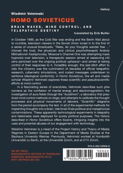 In October 1989, as the Cold War was ending and the Berlin Wall about to crumble, television viewers in the Soviet Union tuned in to the first of a series of unusual broadcasts. Relax, let your thoughts wander free... intoned the host, the physician and clinical psychotherapist Anatoly Mikhailovich Kashpirovsky. Moscow's Channel One was attempting mass hypnosis over television, a therapeutic session aimed at reassuring citizens panicked over the ongoing political upheaval and aimed at taking control of their responses to it. Incredibly enough, this last-ditch effort to rally the citizenry was the culmination of decades of official telepathic research, cybernetic simulations, and coded messages undertaken to reinforce ideological conformity. In Homo Sovieticus, the art and media scholar Wladimir Velminski explores these scientific and pseudoscientific efforts at mind control.
