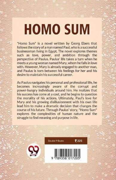 "Homo Sum" is a novel written by Georg Ebers that follows the story of a man named Paul, who is a successful businessman living in Egypt. The novel explores themes such as love, power, and ambition through the perspective of Paulus. Paulus' life takes a turn when he meets a young woman named Mary, whom he falls in love with. However, Mary is already engaged to another man, and Paulus is torn between his feelings for her and his desire to maintain his successful career. As Paulus navigates his personal and professional life, he becomes increasingly aware of the corrupt and power-hungry individuals around him. He realizes that his success has come at a cost, and he begins to question the morality of his actions. Ultimately, Paul's love for Mary and his growing disillusionment with his own life lead him to make a dramatic decision that changes the course of his future. Through Paulus' story, "Homo Sum" explores the complexities of human nature and the struggle to find meaning and purpose in life.