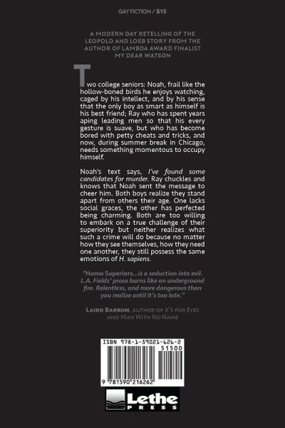 Two college seniors: Noah, frail like the hollow-boned birds he enjoys watching, caged by his intellect, and by his sense that the only boy as smart as himself is his best friend; Ray who has spent years aping leading men so that his every gesture is suave, but who has become bored with petty cheats and tricks, and now, during summer break in Chicago, needs something momentous to occupy himself. Noah's text says, I've found some candidates for murder. Ray chuckles and knows that Noah sent the message to cheer him. Both boys realize they stand apart from others their age. One lacks social graces, the other has perfected being charming. Both are too willing to embark on a true challenge of their superiority but neither realizes what such a crime will do because no matter how they see themselves, how they need one another, they still possess the same emotions of H. sapiens. A finalist for the Lambda Literary Award for Best Gay Mystery!
